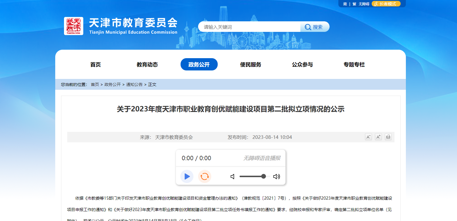 8月14日,天津市教育委員會(huì)在其官網(wǎng)發(fā)布《關(guān)于2023年度天津市職業(yè)教育創(chuàng)優(yōu)賦能建設(shè)項(xiàng)目第二批擬立項(xiàng)情況的公示》,依據(jù)《市教委等15部門(mén)關(guān)于印發(fā)天津市職業(yè)教育創(chuàng)優(yōu)賦能建設(shè)項(xiàng)目和資金管理辦法的通知》(津教規(guī)范〔2021〕7號(hào)),按照《關(guān)于做好2023年度天津市職業(yè)教育創(chuàng)優(yōu)賦能建設(shè)項(xiàng)目申報(bào)工作的通知》和《關(guān)于做好2023年度天津市職業(yè)教育創(chuàng)優(yōu)賦能建設(shè)項(xiàng)目第二批立項(xiàng)任務(wù)書(shū)填報(bào)工作的通知》要求,經(jīng)院校申報(bào)和專(zhuān)家評(píng)審,確定第二批擬立項(xiàng)單位名單。天津工業(yè)職業(yè)學(xué)院等7所學(xué)校列入市級(jí)高水平專(zhuān)業(yè)群建設(shè)項(xiàng)目,天津交通職業(yè)學(xué)院、天津?yàn)I海汽車(chē)工程職業(yè)學(xué)院列入改善辦學(xué)條件項(xiàng)目。