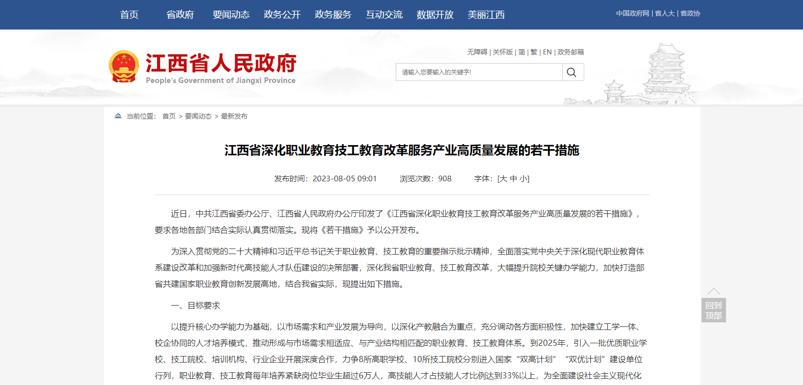 近日,中共江西省委辦公廳、江西省人民政府辦公廳印發(fā)了《江西省深化職業(yè)教育技工教育改革服務(wù)產(chǎn)業(yè)高質(zhì)量發(fā)展的若干措施》,要求各地各部門結(jié)合實(shí)際認(rèn)真貫徹落實(shí)?,F(xiàn)將《若干措施》予以公開發(fā)布。
