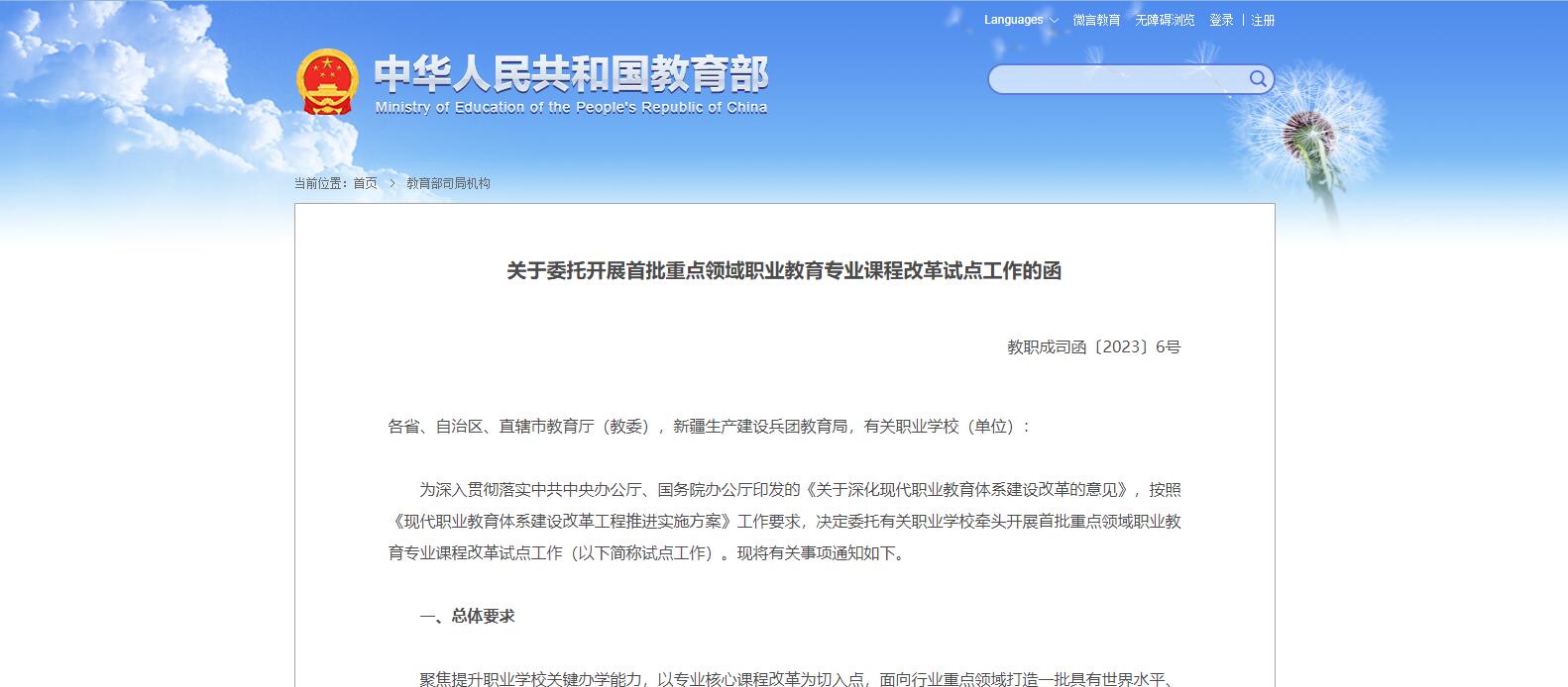 教育部職成司發(fā)布關(guān)于委托開展首批重點(diǎn)領(lǐng)域職業(yè)教育專業(yè)課程改革試點(diǎn)工作的函